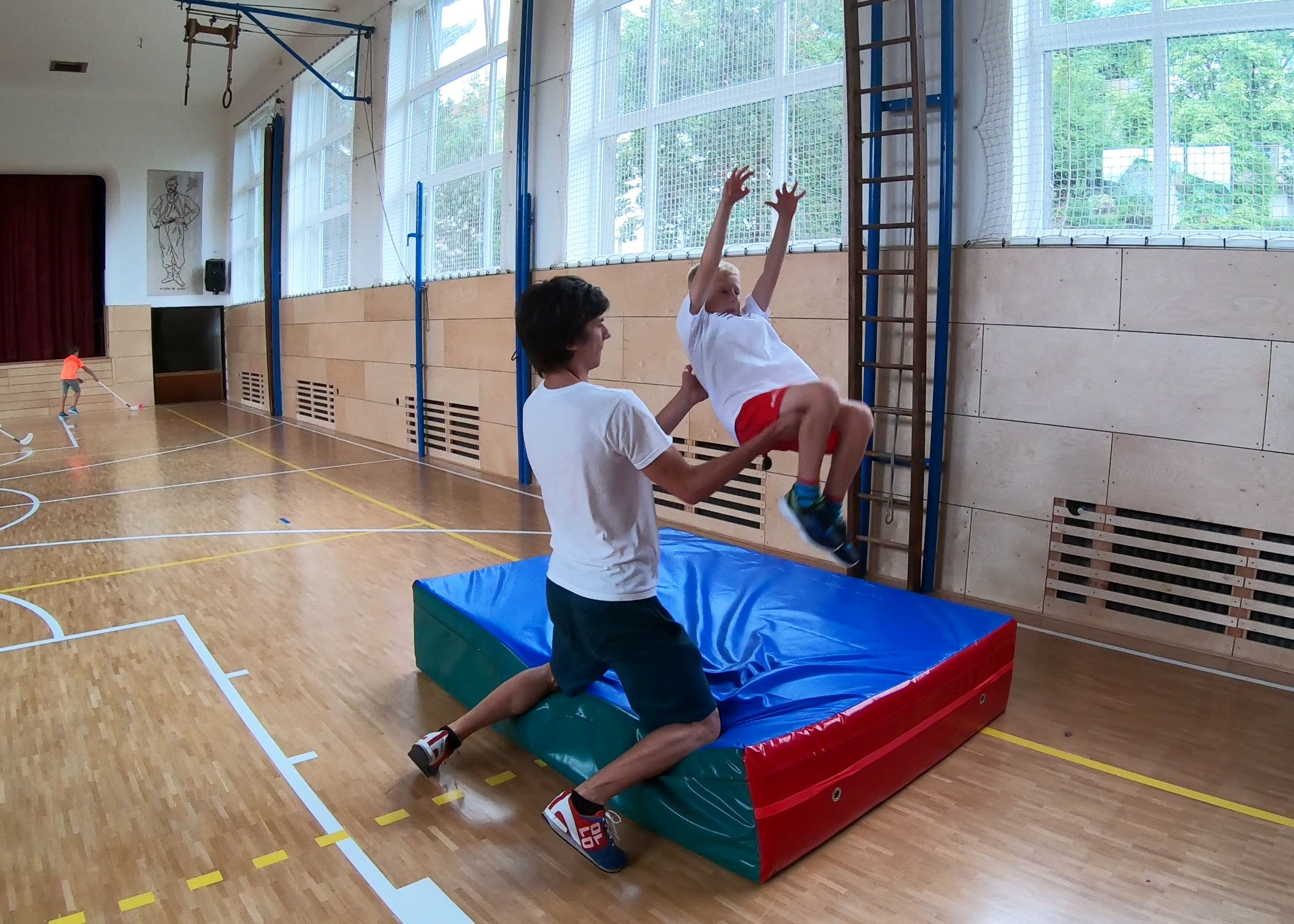 Ráno se sejdeme v 8:00. Začínáme rozcvičkou, do které zařazujeme týmové hry. Po rozcvičce začínáme trénovat. Nejprve trenér vysvětlí techniky a poté skáčeme. Jednotlivé prvky jsou vždy nacvičovány bezpečně s lektorem.Další fotky