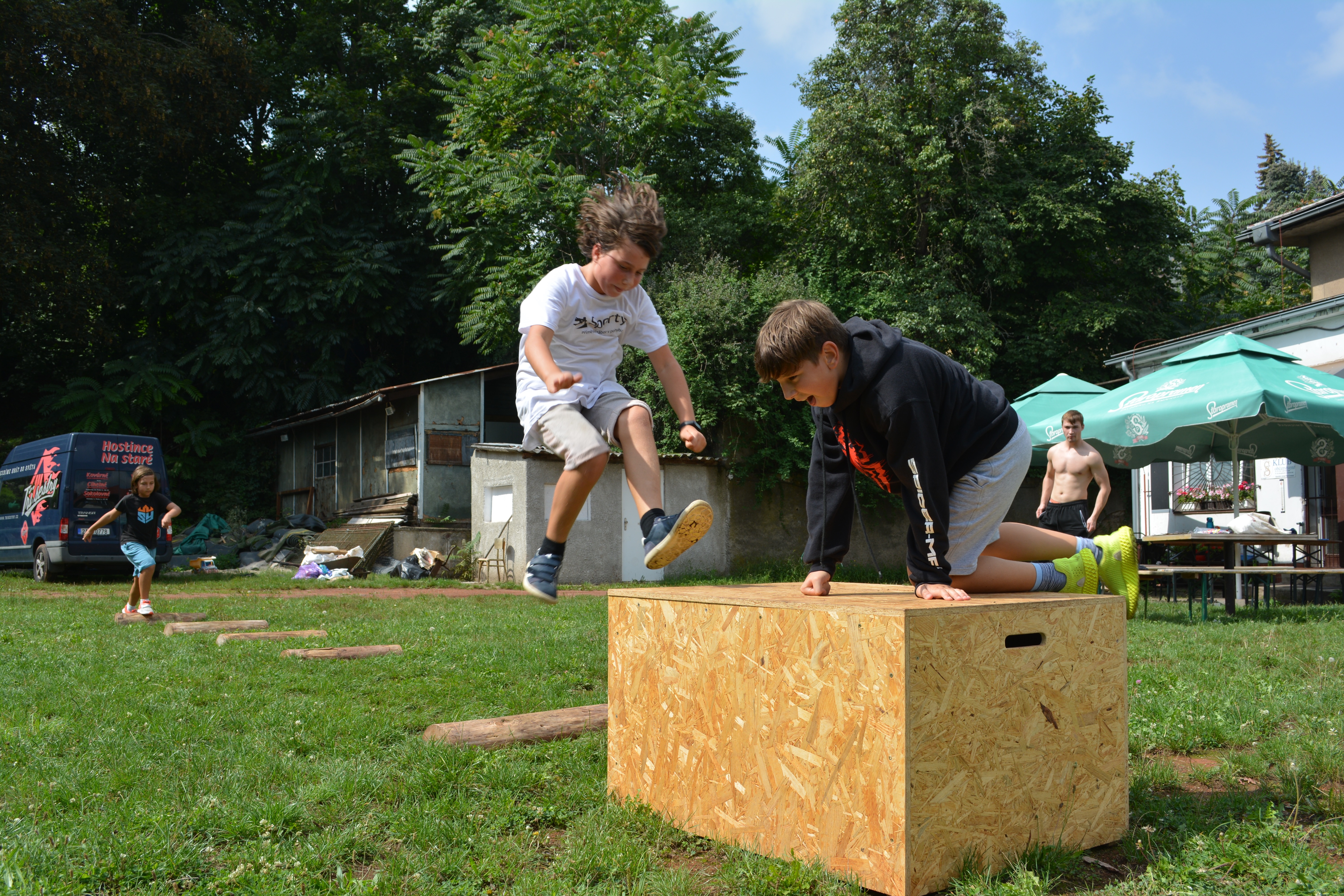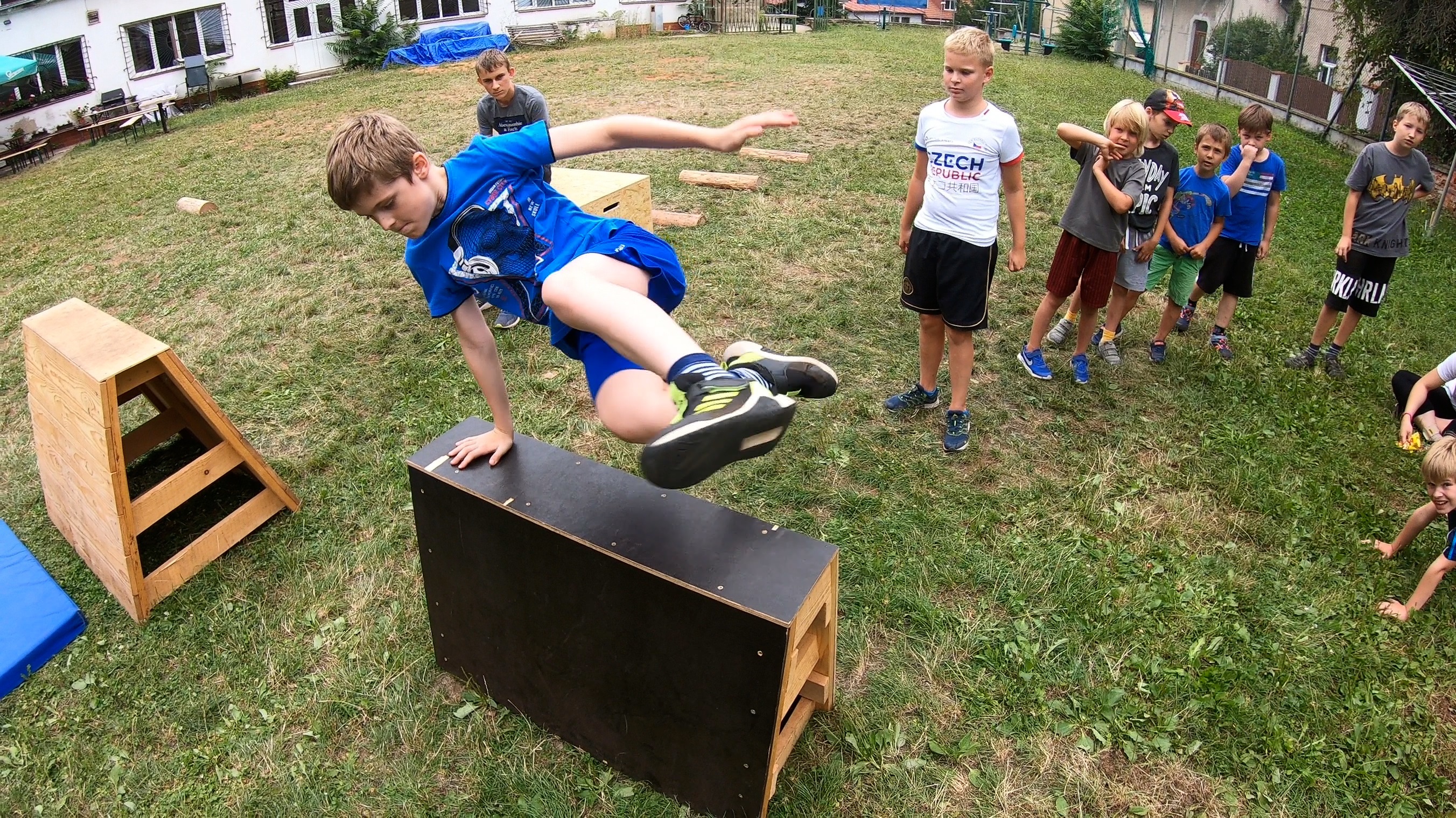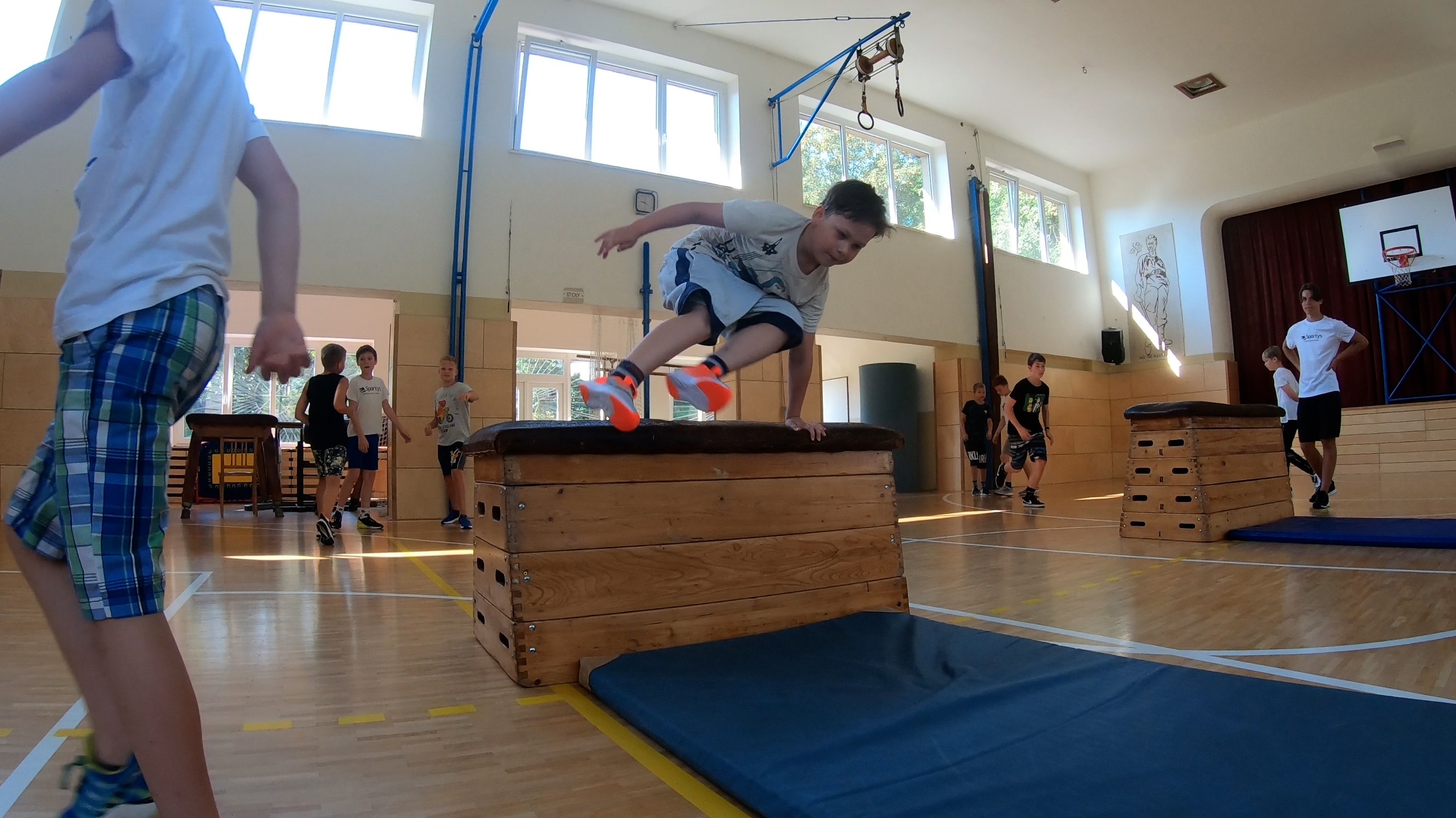 Parkour trénujeme v tělocvičně na bednách a nářadí, složitější techniky pak bezpečně nacvičujeme na matracích. Venku zlepšujeme naučené techniky na dřevěných překážkách. Všechny naučené prvky pak na opičí dráze navazujeme do flow.