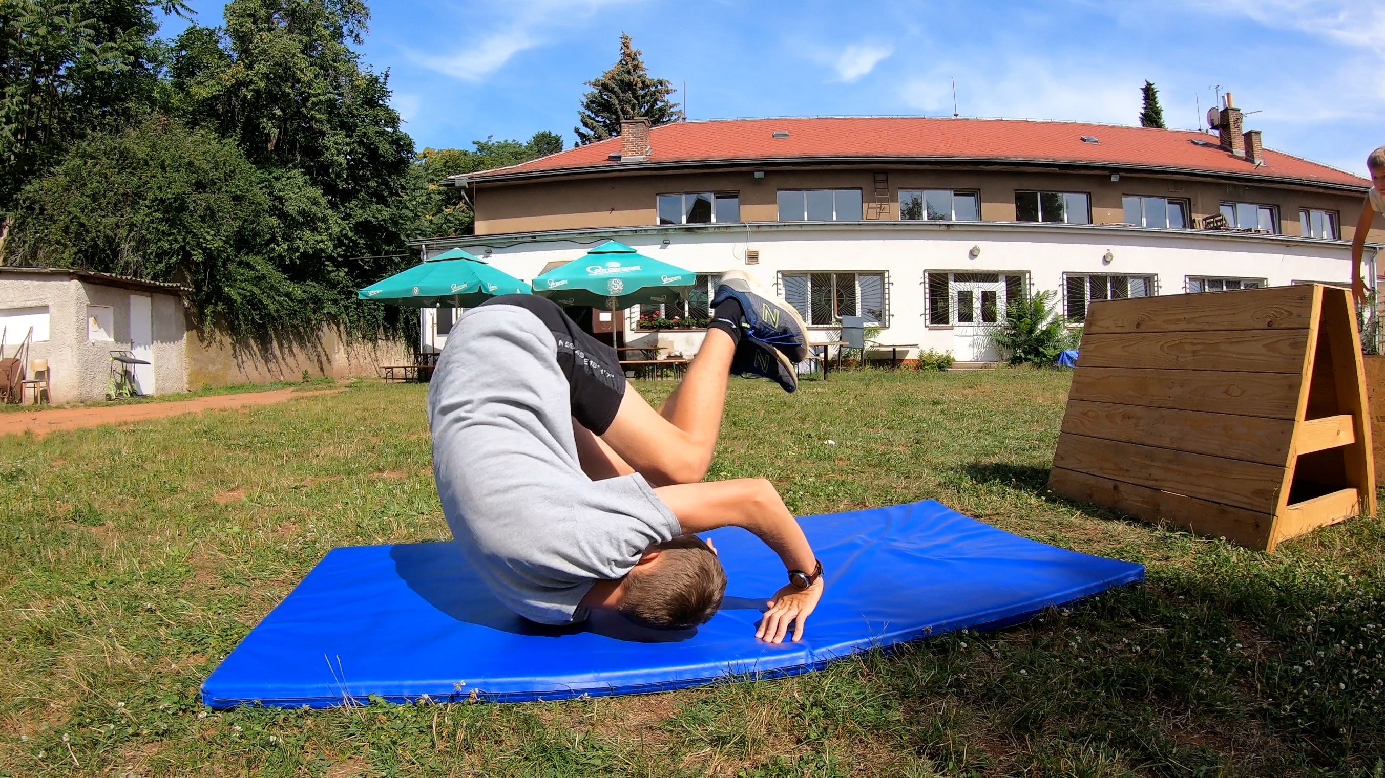 Trénujeme hlavně v tělocvičně, kde nacvičujeme složitější prvky a akrobacii na měkých matracích a žíněnkách. Podle počasí pak naučené techniky trénujeme venku na vlastních překážkách. Máme dřevěné překážky na trénink precisů a vaultů.