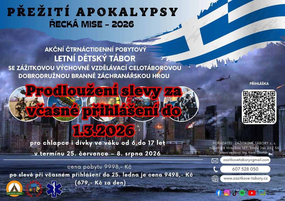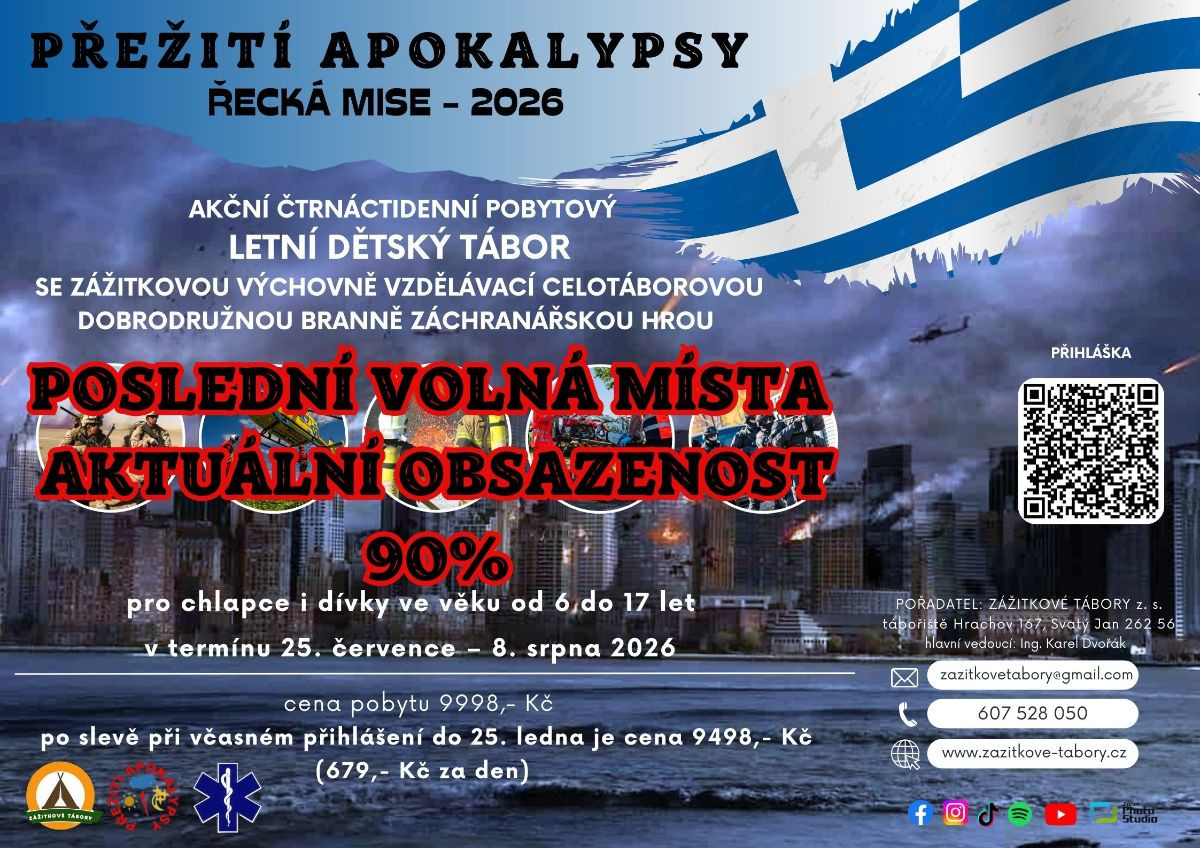 Dovolte nám představit náš akční čtrnáctidenní pobytový letní dětský tábor, na kterém kromě zotavovacího a rekondičního charakteru přinášíme i zážitkovou výchovně vzdělávací celotáborovou dobrodružnou branně záchranářskou hru. Přežití apokalypsy 2026 - Řecká mise