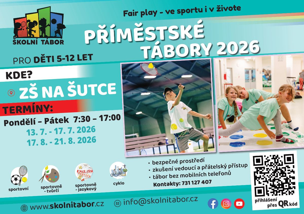 Školní tábor nabízí příměstské tábory v Praze pro děti od 5 do 12 let. Naše sportovní, sportovně-tvůrčí, sportovně-jazykové a cyklo příměstské tábory patří mezi oblíbené volby rodičů, kteří hledají bezpečné prostředí, kvalitní program a zkušené instruktory. Tábory probíhají v několika pražských lokalitách přímo na základních školách a v sokolovnách. Děti čeká pestrý týden plný sportu, tvorby a nových kamarádství. V rámci sportovního programu se věnujeme aktivitám jako tenis, badminton, florbal, frisbee, gymnastika, inline bruslení, orientační běh nebo lukostřelba. Pro děti, které rády tvoří, nabízíme sportovně-tvůrčí program s aktivitami, jako jsou např. malování na sklo, výroba náramků, origami či tvoření z přírodních materiálů. Instruktoři Školního tábora jsou studenti a absolventi sportovních a pedagogických oborů. Všichni procházejí školením první pomoci a dbají na férový, individuální a bezpečný přístup. Naším cílem je budovat u dětí zdravé sebevědomí, respekt k ostatním a hodnoty fair play – ve sportu i v životě. V ceně tábora je zahrnuto: • dopolední i odpolední svačina • teplý oběd (polévka + hlavní jídlo) a celodenní pitný režim • kvalitní funkční tričko pro každé dítě • bezpečné prostředí, kde děti tráví čas aktivně a bez mobilních telefonů Příměstské tábory Školního tábora probíhají v několika pražských lokalitách (Praha 4, 5, 6, 8, 9), aby si rodiče mohli vybrat místo podle bydliště či školy. Přihlášky a kompletní informace najdete na webu. Při přihlášení sourozenců na stejný termín - sleva 5%Video z tábora