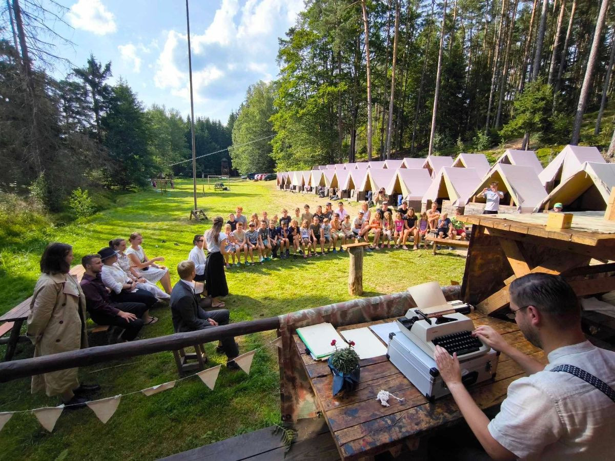 Pořádáme dětský tábor na 3 týdny v přírodě. Děti spí v podsadových stanech po dvojicích. Zázemí tvoří suché wc, srub s kuchyní a jídelnou, umývárky s teplou vodou. Tábor se nese v duchu celotáborové hry, děti ve skupinkách soutěží v různých etapách. Celková kapacita tábořiště je cca 35 dětí