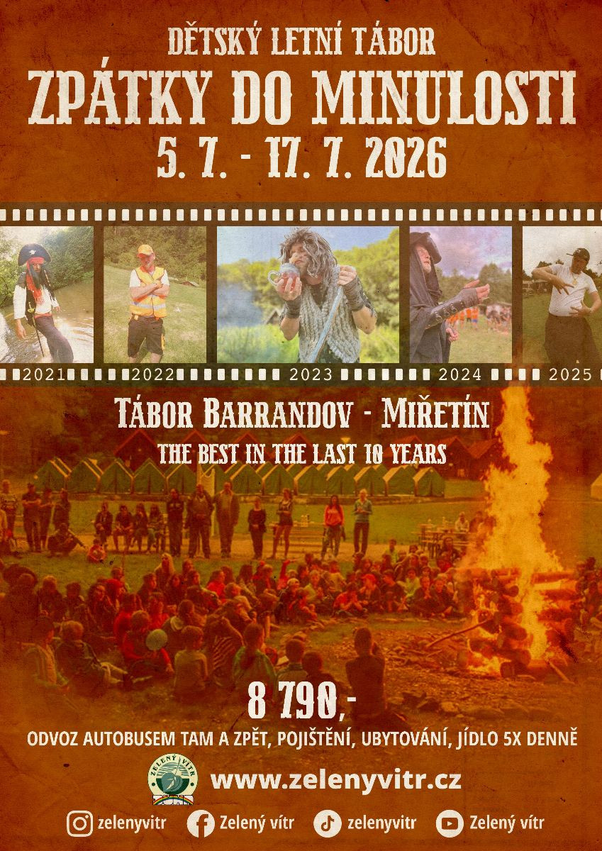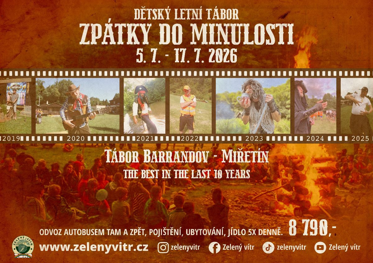 Pro rok 2026 jsme se rozhodli jako téma zvolit „Zpátky do minulosti“. Vedlo nás k tomu ta skutečnost, že po krásných deseti letech jsme byli nuceni změnit naší základnu. Chceme si na těchto 10 let zavzpomínat tím, že každý den se ponese v duchu jednoho z témat, které jsme v Herolticích prožili. Všechna témata si můžete shlédnout na našich webovkách či sociálních sítích. Areál Tábora Barrandov je jedním z nejdéle provozovaných a nejlépe vybavených letních tábořišť v České republice. Leží na území Města Proseč v okresu Chrudim, uprostřed lesů v malebném údolí říčky Krounky zvaném Kablaně, mezi obcemi Otradov, Miřetín a Česká Rybná. Areál patří do katastrálního území Miřetín a celý je součástí přírodního parku Údolí Krounky a Novohradky. Kolem areálu tábora vede červená turistická značka a cyklotrasa Mikroregionu Maštale číslo 2. Celá oblast, ve které se tábor nachází, se vyznačuje nenarušeným a velmi čistým životním prostředím, což je jedna z jeho velmi cenných deviz. Táboru se zúčastní cca 130 dětí. Dětí budou ubytované v podsadových stanech, nebo v chatkách (budou si moci vybrat). Tábor řídí hlavní vedoucí s desetiletou praxí (absolvent kursu akreditovaného Ministerstvem školství). O každý oddíl se starají dva oddíloví vedoucí (všichni absolvovali školení). Většinou jeden s několikaletou praxí + nováček, který absolvoval s námi 2 až 3 tábory. Zdravotní zajištění: 2 zdravotnice + promovaný lékař, přímo v areálu RS. Vaří profesionální kuchaři.Další fotky